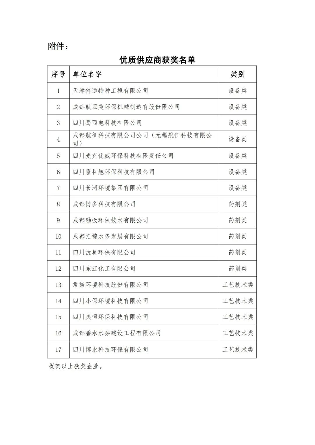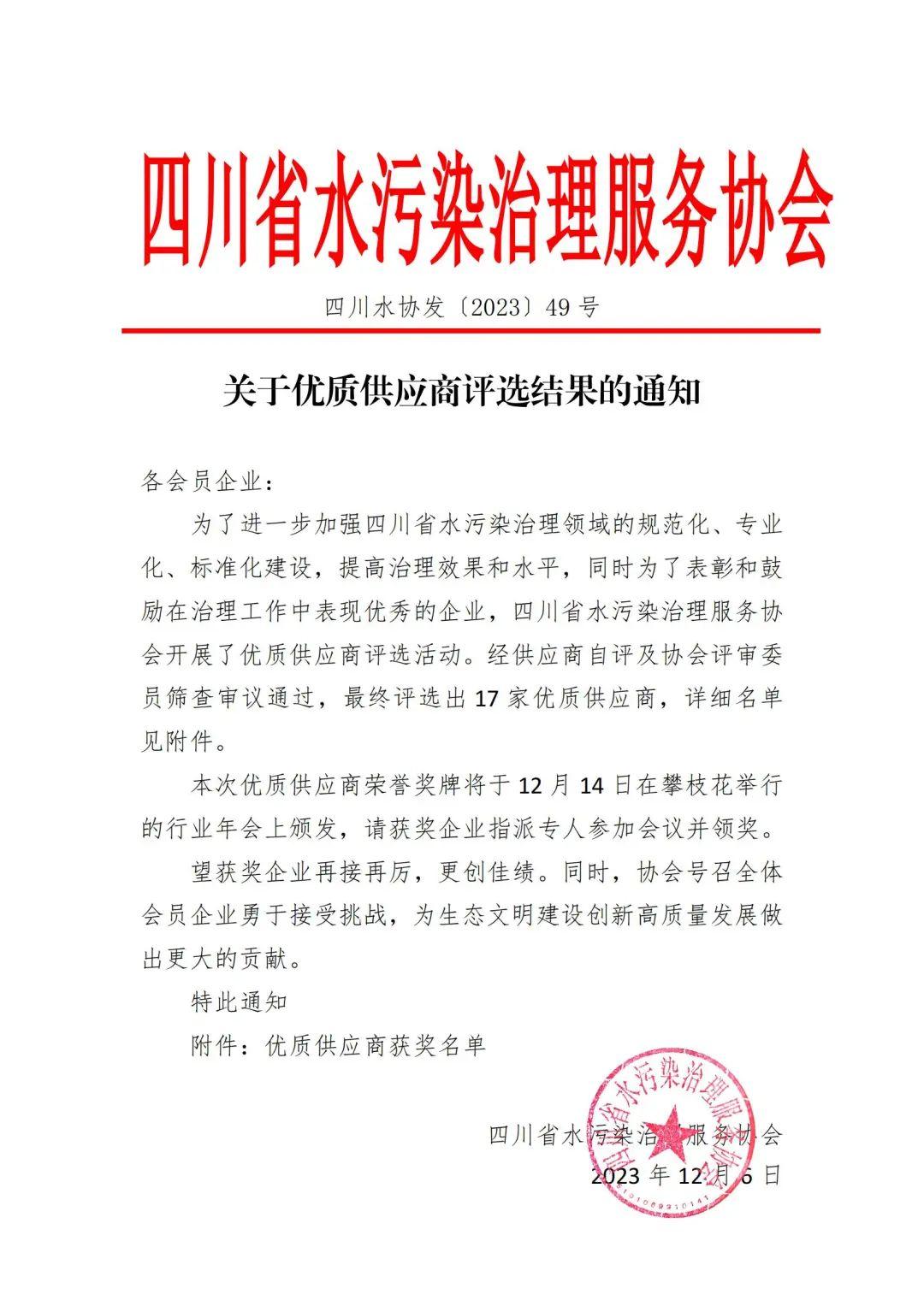 四川省水污染治理服務(wù)協(xié)會評選出的17家優(yōu)質(zhì)供應(yīng)商中,有幸看到了我們的名字!
